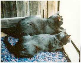August 16, 1989 Age: 12 Sex: male Weight: 13 lbs. Residence: New York, New York Significance of name: He's named for the town of Milo, Maine, where I have a cabin. IQ: 150. He can read my mind. When it's time to put him in his carrier he seems to know to make himself scarce. It doesn't matter how clever I think I'm being in keeping him from knowing that we'll be traveling (like packing the trunk 3 days in advance and not leaving stuff by the door), he figures it out. And he always knows when a can I happen to be opening is not for him. Purrometer index: average in intensity and pitch. If I give him a quick pat or stroke him for just a few seconds he doesn't purr. He starts up only if he senses I'm committed to petting him. Favorite place to hang out: tree house in the living room Favorite toy: a stuffed Alf. He ripped its face off, which pleased me greatly. I sewed it back together with wanton carelessness to give it a more bearlike look. Favorite people food: rice, canned salmon Favorite thing to chew: plastic bags or the plastic handles on shopping bags. I do my best to keep these away from him. Best trick: chasing a ball of aluminum foil and bringing it back for me to throw again -- he won't do this with a paper ball. He taught me this trick, by the way. Temperament/personality: warm, friendly, likes people; athletic. Cutest thing Milo does: rolling on his back and looking at me upside down with paws up. Least appreciated thing he does: eating Beatlejuice's food On a scale of 1 to 10, how human is Milo?: 8. He's considerably more evolved than a human. Some human things Milo does are: knot a necktie, polish the furniture, and clean the sink. If Milo could talk, he'd say: "Lose the carrier, huh, chief?" Memorable moment: Milo was my first cat, and when I introduced Beatlejuice into the apartment, I did it by the book to ensure that Milo would adjust. I kept Beatlejuice in a closed room for 3 or 4 days. Milo was exceedingly curious. When I finally opened the door, they touched noses, and Milo hissed -- once -- and within a half hour they were playfully chasing each other. Milo was great -- dominant but not a bully. Amusing thing Milo did as a kitten: When he was small, he would spring onto the back of a wicker rocking chair, sort of claw his way up to the top, go over the top, and descend down the front. Of course, the chair would rock a bit as he did this. As weeks went by and he got bigger the chair would rock more extremely, until he got too strong and too large and the chair would fall over. Cute story: May the gods strike me down if I have a "cute" story. Comment: Not sure if Milo belongs on this site. He's not really cute, he's The Man. |